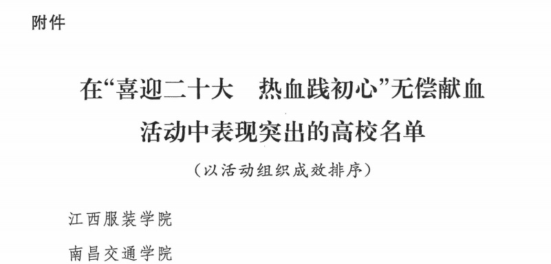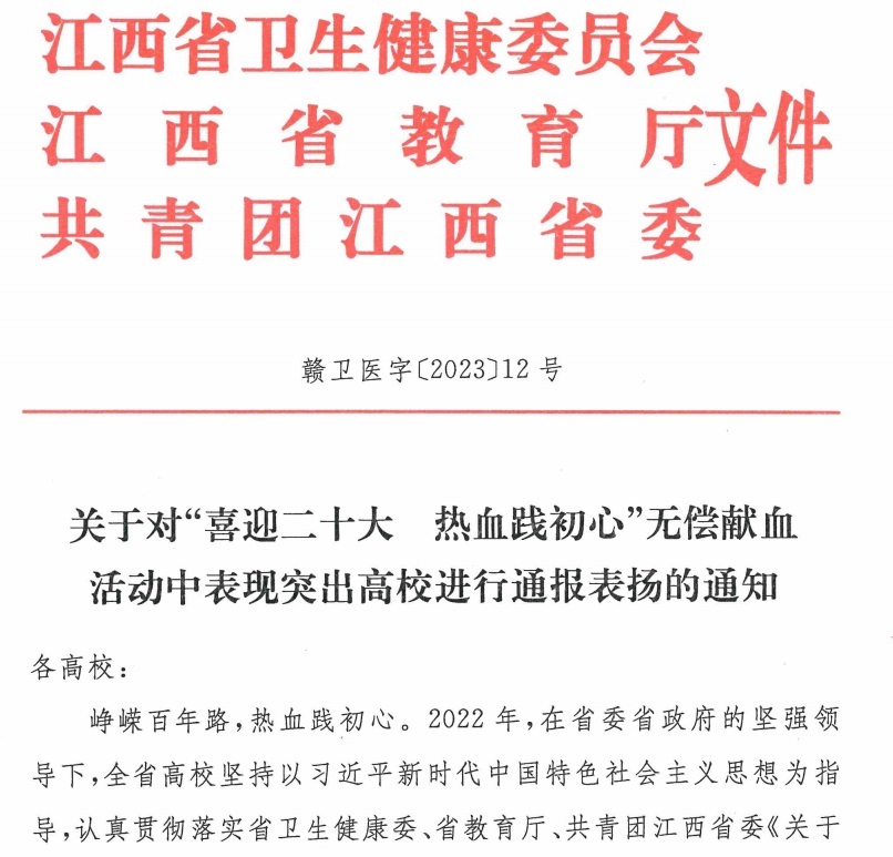 近日,江西省卫生健康委员会、江西省教育厅、共青团江西省委联合下发《关于对“喜迎二十大 热血践初心”无偿献血活动中表现突出高校进行通报表扬的通知》赣卫医字【2023】12号文件,我校因在“喜迎二十大 热血践初心”无偿献血活动中表现突出,获通报表扬。(文/付园)