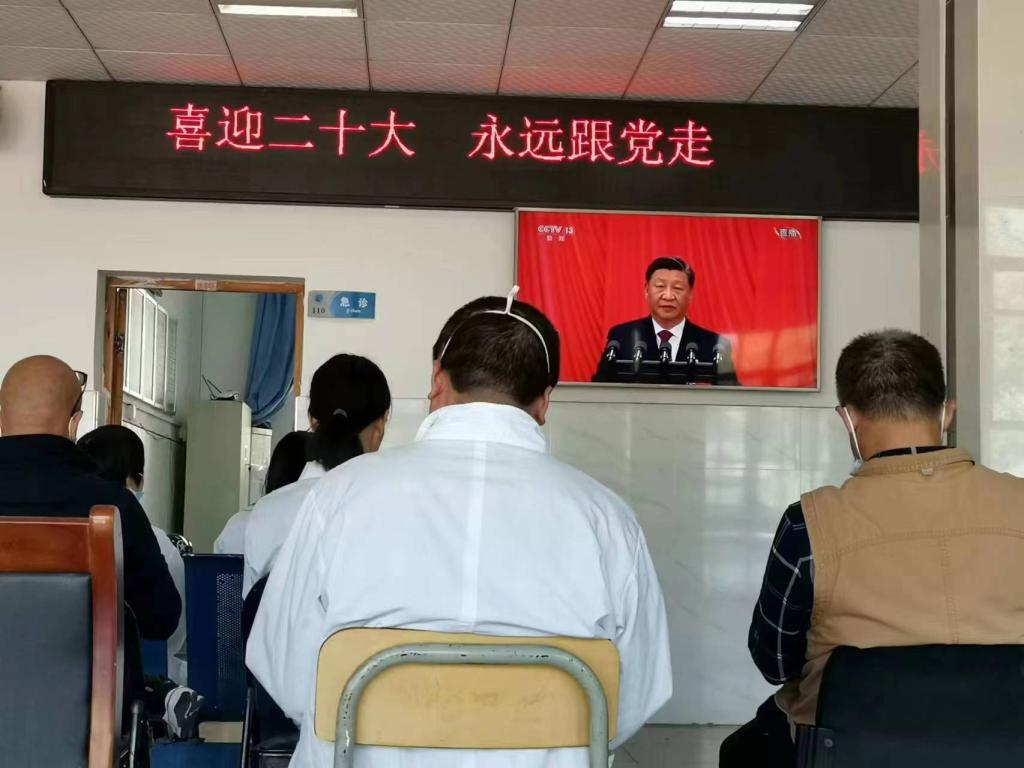 在场的医务人员认真聆听了习近平总书记在中国共产党第二十次全国代表大会上的报告,积极发言,纷纷表示:党的二十大,绘就了我国一个崭新的蓝图!党的二十大,将开启中国梦的新希望!喜迎二十大,放歌新时代,赞颂伟大的中国共产党!(文/洪国辉 图/姜慧萍)